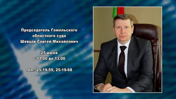 25 июня с 11.00 до 13.00 выездной прием граждан и представителей юридических лиц в здании суда Мозырского района (ул. Пролетарская, д. 86, каб. 2-1) проведет председатель Гомельского областного суда Шевцов Сергей Михайлович.