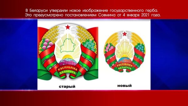 В Беларуси утвердили новое изображение государственного герба. Это предусмотрено постановлением Совмина от 4 января 2021 года. Само изображение герба осталось тем же, однако изменились детали. Так, контур страны стал золотым вместо зеленого, изменились формы колосьев, клевера и льна. Изменился также цвет материков на земном шаре — они стали темно-оранжевыми вместо синих. Сам шар немного развернулся, теперь на нем видно больше Европы. Замена изображения, которое не соответствует эталонным изображениям, осуществляется по мере его использования или прихода в негодность.