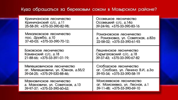 Из года в год лесничества делают акцент на продажу березового сока населению. Кроме того, мозырский березовый сок отправляется на перерабатывающее предприятие в Бобруйск. Напомним, за нарушение правил сбора березового сока можно поплатиться штрафом.