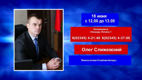 Министр юстиции Олег Слижевский проведет 18 июня выездной прием граждан в Калинковичах. Министр будет принимать с 12.00 до 13.00 в Калинковичском районном исполнительном комитете (Калинковичи, площадь Ленина, 1) по вопросам, относящимся к компетенции Министерства юстиции. Предварительно записаться на прием можно через Калинковичский райисполком по телефонам 8(02345) 42140, 8(02345) 43700.