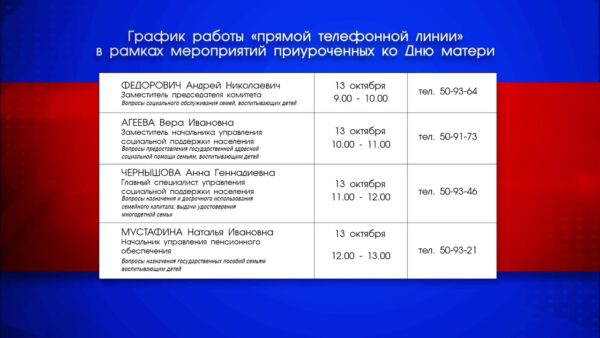 13 октября, в рамках мероприятий, приуроченных ко Дню матери, прямые линии проведут специалисты Комитета по труду, занятости и социальной защите Гомельского областного исполнительного комитета: