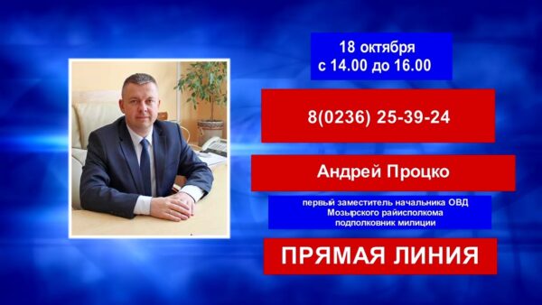 Во вторник, 18 октября, на вопросы населения ответит первый заместитель начальника ОВД Мозырского райисполкома подполковник милиции Андрей Вячеславович Процко. Прямая телефонная линия будет работать с 14.00 до 16.00. Звонить в указанное время по номеру: 8-0236-25-39-24.