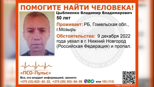 50-летнего гражданина Республики Беларусь, Цыблиенко Владимира, ищут в Нижегородской области. Об этом сообщают представители поисково-спасательного центра «Рысь» в социальных сетях. По данным поисковиков, мужчина проживает в городе Мозырь Гомельской области. Согласно информации, 9 декабря 2022 года он уехал в Нижний Новгород и пропал. С тех пор нахождение Цыблиенко Владимира неизвестно. Всем, кому что-либо известно о местонахождении пропавшего, просьба сообщить по телефонам: +375336224222, +375293539409 или 102.