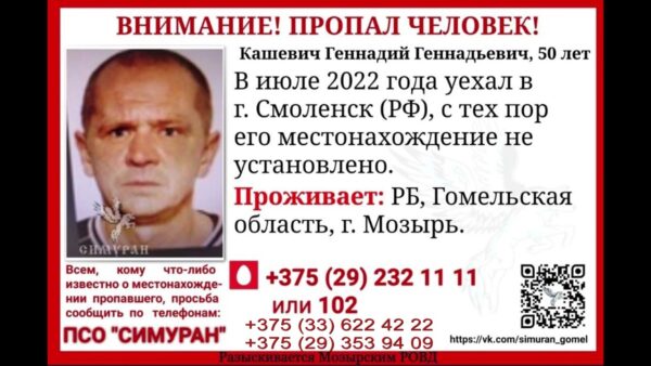 Мозырский РОВД совместно с поисково-спасательными отрядами «Пульс» и «Симуран» объявил поиск человека, который может находиться на территории Смоленской области. Кашевич Геннадий Геннадьевич, 50-ти лет. Мужчина проживал в Мозыре. Еще в июле 2022 года он уехал в Смоленск и с тех пор о его местоположении ничего не известно. Всем, кому что-либо известно о Геннадии Кашевиче, просьба сообщить по телефонам: +375336224222, +375293539409 или 102