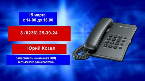 15 марта 2023 с 14:00 до 16:00 прямую телефонную линию проведет заместитель начальника ОВД Мозырского райисполкома – начальник криминальной милиции подполковник милиции Козел Юрий Александрович. Звонить в указанное время по номеру 80236 25 39 24.