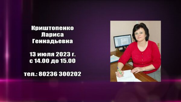 13 июля 2023 года с 14.00 до 15.00 «горячую телефонную линию» проведет Криштопенко Лариса Геннадьевна – начальник отдела жилищно-коммунального хозяйства Мозырского райисполкома (г. Мозырь, пл. Ленина,16, к. 100). Телефон «горячей телефонной линии»: 8-0236- 30-02-02.
