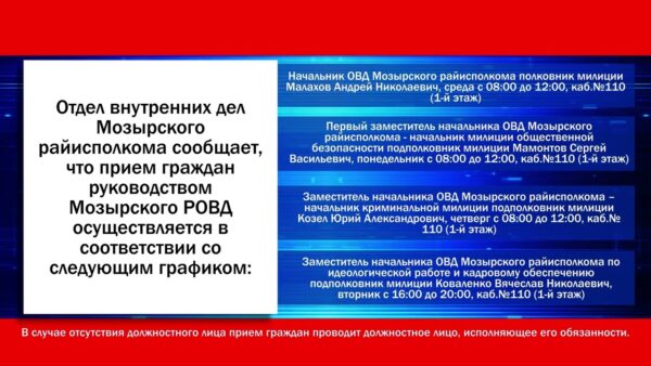 Отдел внутренних дел Мозырского райисполкома сообщает, что прием граждан руководством Мозырского РОВД осуществляется в соответствии со следующим графиком: