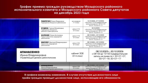 Согласно утверждённому графику, прием граждан руководством Мозырского райисполкома и Совета депутатов будет осуществляться регулярно. Так, председатель райисполкома Елена Павлечко прием граждан в декабре проведет дважды: 13-го и 27-го числа. Председатель Районного Совета депутатов Галина Кудина –20 декабря. Заместители председателя исполкома Елена Каленик, Дмитрий Миллер, Феликс Галюк, Василий Климович и управляющий делами райисполкома Ирина Апанасенко принимать граждан будут 6 и 20 декабря. В графике обозначены номера кабинетов приема. Время приема: с 8 до 13 часов. Предварительно нужно записаться по указанным телефонам. 30-01-16,30-01-17, 30-01-07.