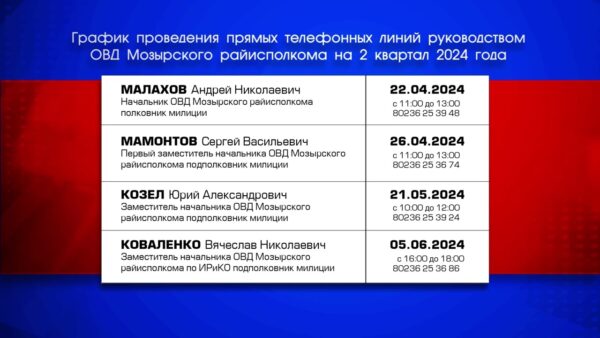 Графики проведения прямых телефонных линий руководством ОВД Мозырского райисполкома на 2 квартал 2024 г.