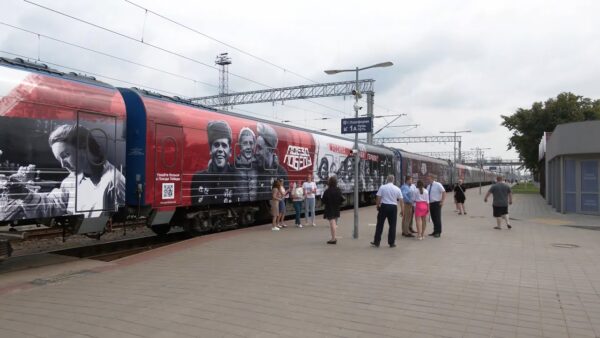 На первой платформе железнодорожного вокзала в Калинковичах состав, который сразу бросается в глаза. На вагонах фотографии и говорящие надписи – Родина, встречай героев! Домой на родину, победа будет за нами. Это уникальный передвижной интерактивный музей «Поезд Победы».