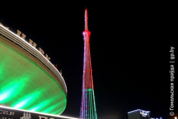 Светодиодный медиафасад телевышки в Гомеле облачился сегодня в цвета государственного флага.