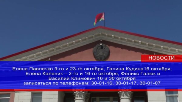 Председатель районного Совета депутатов Галина Кудина прием граждан проведет 16 октября. Первый заместитель председателя исполкома Елена Каленик – 2-го и 16-го октября. Заместитель председателя Дмитрий Миллер – 2-го и 30-го октября. Заместители председателя Феликс Галюк, Василий Климович и управляющий делами райисполкома Ирина Апанасенко принимать граждан будут 16 и 30 октября. Время приема: с 8 до 13 часов. Предварительно нужно записаться по телефонам. 30-01-16,30-01-17, 30-01-07.