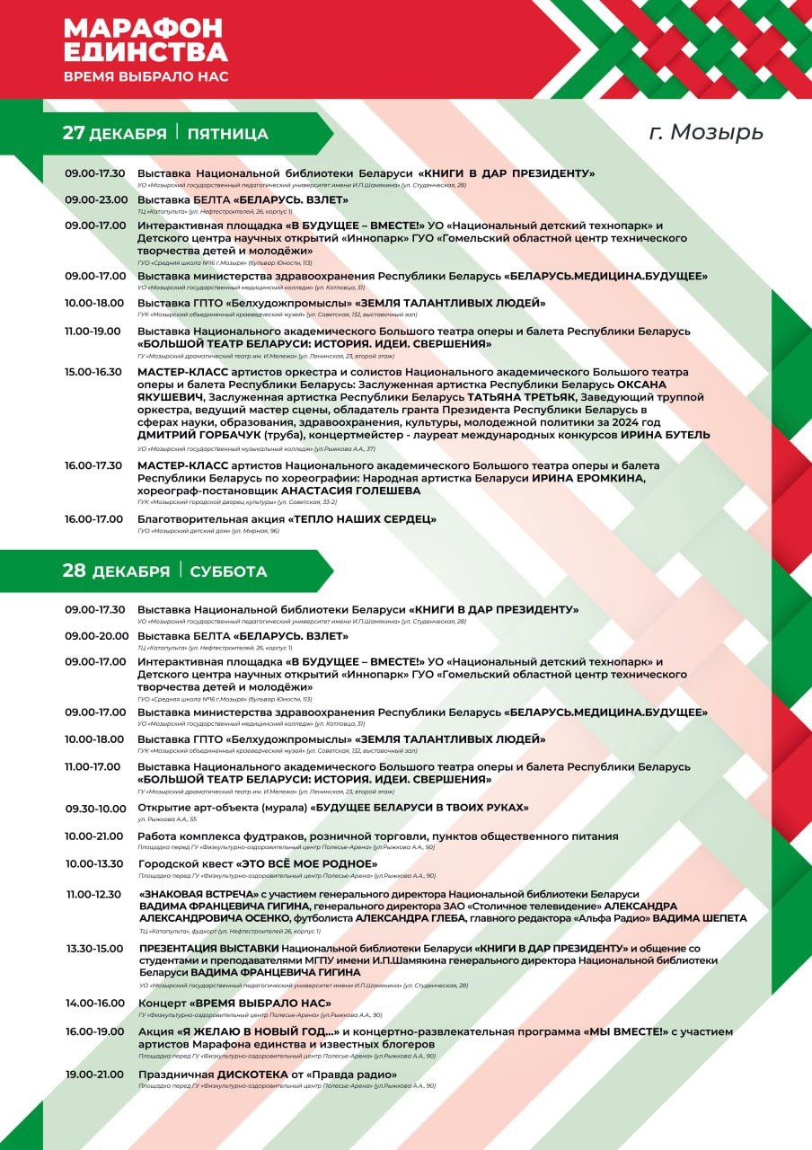 Марафон стартует в пятницу, 27 декабря. В первый день с 9.00 в городе над Припятью начнут работу выставки «Беларусь. Взлет», «Беларусь. Медицина, Будущее», «Земля талантливых людей» и другие, а также интерактивная площадка «В будущее — вместе!».