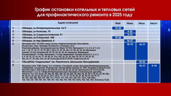 Со 2 по 13 июня горячей воды не будет в домах на станции Мозырь. С 9 по 20 июня – в первом микрорайоне, где будет проходить плановый ремонт котельной по ул. Рыжкова, 15. С 16 по 27 июня останавливают котельную по переулку Швейный, 4. Тепловые сети «НС ВПК – город» будут ремонтировать дважды в сезон: с 10 по 19 июня и с 15 по 17 июля. В это время без горячей воды останутся жители улиц Нефтестроителей, Полесская, Шоссейная, Лазо, Чапаева, Котовского, Кеника, 33-й ракетной дивизии, Лельчицкое шоссе, а также некоторые дома по улицам Мира, Притыцкого, Малинина, бульвару Юности. Также два раза в сезон – с 15 по 17 июля и с 5 по 14 августа, остановят вторую крупную теплосеть «СВК-город» Полный список адресов смотрите на ваших экранах. С 10 по 22 июля горячее водоснабжение будет отсутствовать на улицах Ракицкого, Школьной и Молодежной. Коммунальники обещают, что количество дней без горячей воды может быть сокращено.
