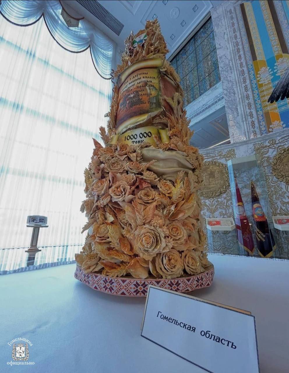 Золотые колосья, цветы, символика и заветная цифра – миллион тонн. Каравай-миллионник от Гомельской области присоединился к ароматной коллекции во Дворце Независимости. В этом году лучшие пекари региона исполнили его в лучших белорусских традициях. Главным украшением каравая стал свёрток, на котором написаны строки из песни про хлеб Михаила Курило: