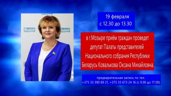 Депутат Палаты представителей Национального собрания по Мозырскому избирательному округу № 42 Оксана Ковалькова проведет прием граждан в райисполкоме (пл. Ленина, 16) с 12.30 до 13.30.