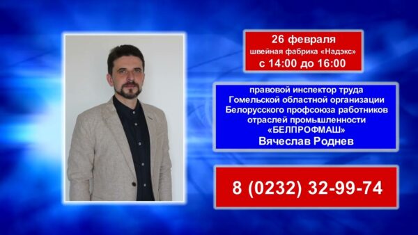 С мозырянами встретится правовой инспектор труда Гомельской областной организации Белорусского профсоюза работников отраслей промышленности «БЕЛПРОФМАШ» Вячеслав Роднев. Место проведения приема – швейная фабрика «Надэкс». Время – с 14 до 16 часов. Предварительно записаться можно по единому номеру телефона: 8 (0232) 32-99-74. Стоит отметить, что на профсоюзные правовые приемы приглашаются сотрудники прокуратуры. Такая форма работы позволяет более оперативно решать проблемы обратившихся.