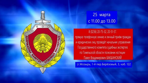 25 марта с 11:00 до 13:00 прямую телефонную линию и личный приём граждан и юридических лиц в здании Мозырского межрайонного отдела Государственного комитета судебных экспертиз (г.Мозырь, 1-й пер.Берёзовый, 3, каб. 122) проведёт начальник управления Государственного комитета судебных экспертиз по Гомельской области полковник юстиции Павел Владимирович БАКШАНСКИЙ.