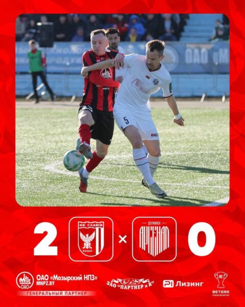 «Славия-Мозырь» обыграла дзержинский «Арсенал» со счетом 2:0 в первом четвертьфинальном матче Кубка Беларуси по футболу. Матч состоялся 8 марта на стадионе в Калинковичах. Голы забили Андрей Соловей (15-я минута) и Терентий Луцевич (62-я минута).