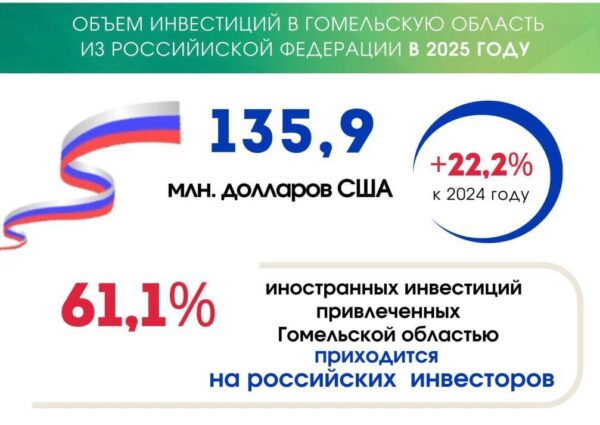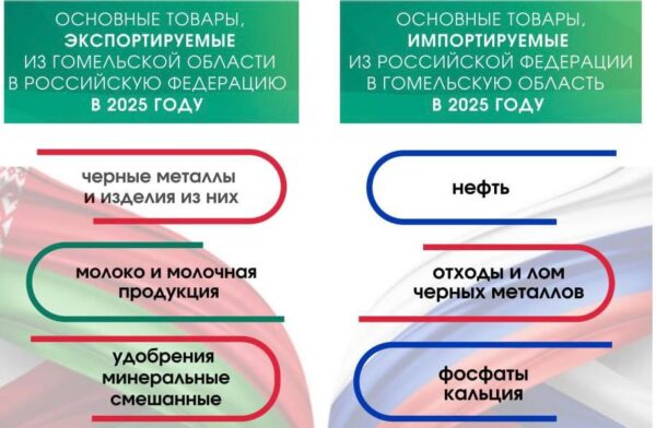 Более 61% иностранных инвестиций, привлеченных Гомельской областью, приходится на российских инвесторов. Основные товары, которые юго-восточный регион Беларуси отправляет в Россию – черные металлы и изделия из них, молочная продукция, удобрения. Из России поставляют нефть, лом черных металлов, фосфаты кальция.
