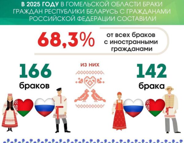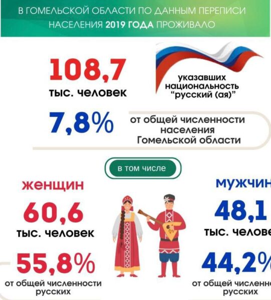 В Гомельской области проживает более 108 тысяч человек, указавших свою национальность как русский. Среди них около 60 тысяч женщин и 48 тысяч мужчин. В 2025 году браки граждан Беларуси с гражданами России составили 68,3% от всех браков с иностранцами.